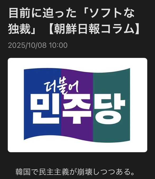 いま韓国で「合法的な独裁」が始まっている 2025 10/12 独裁国家 2025年10月13日 /https://t.co/GTlfSqTi9E 選挙もあり、国会もあり、裁判所もあるのに… でも… その中身が少しずつ壊されているのです。 静かに進む「ソフトな独裁」。 それは… 私たち日本人への警告でもあります。 独裁国家 合法的独裁 よかったらシェアしてね! URLをコピーしました! URLをコピーしました!