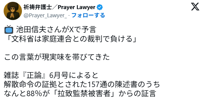 雑誌『正論』6月号によると 解散命令の証拠とされた157通の陳述書のうち なんと88%が「拉致監禁被害者」からの証言