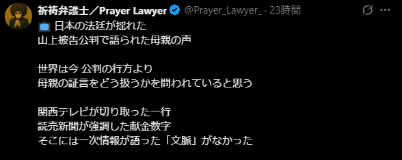 https://twitter.com/Prayer_Lawyer_/status/1991067749163143460?s=20 【📌階層的要約(階層構造で整理)】 ①【主題・テーマ】 日本の山上被告公判において、メディアが「母親の証言」を文脈から切り離して利用し、宗教批判の物語に変換してしまっ...