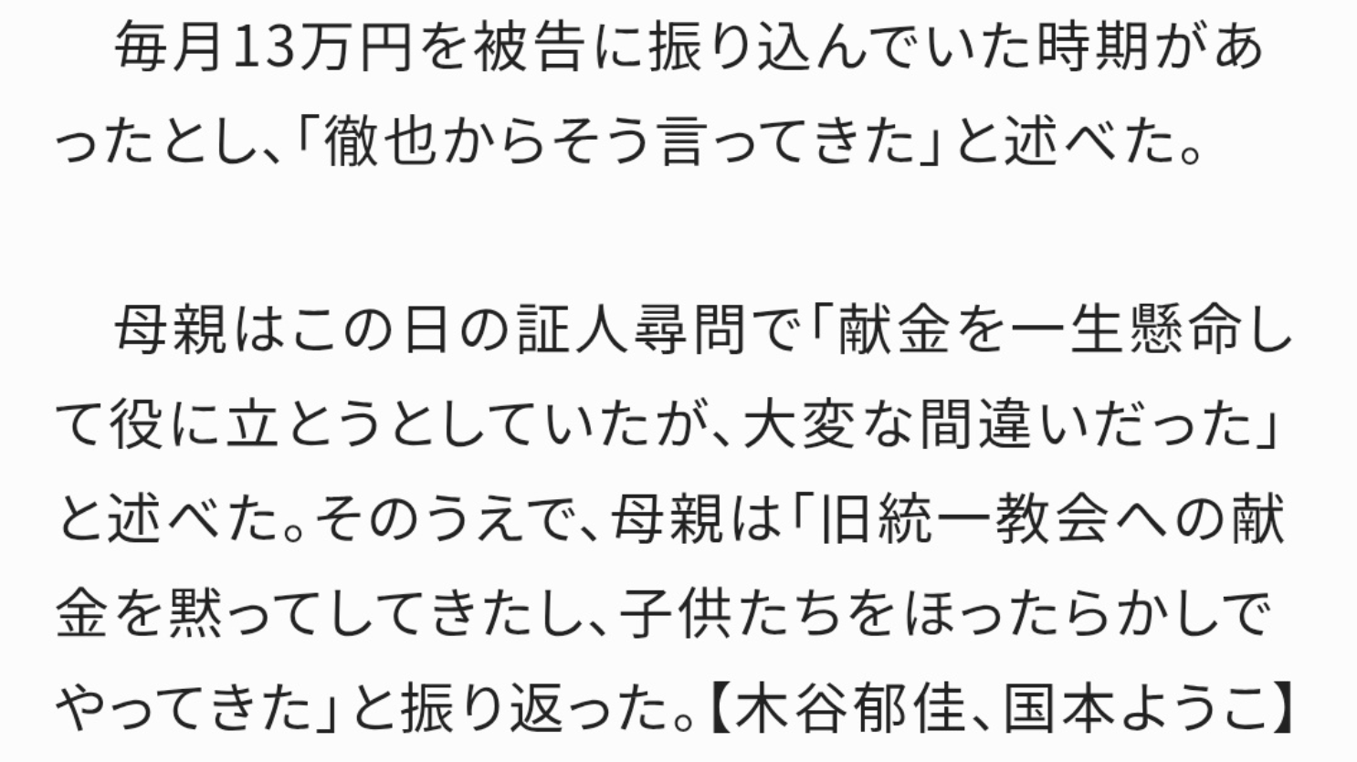 山上裁判で母親の証言が出てきました。裁判の中で母親は5000万円の返金がある過程で毎月13万円を山上被告に振り込んでいたそうです