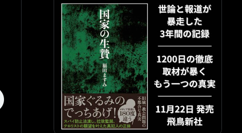 ノンフィクション作家・福田ますみ 新刊 『国家の生贄』(飛鳥新社)11/22発売 https://twitter.com/kyushushinkyo/status/1991664595413692466?s=20 -