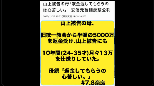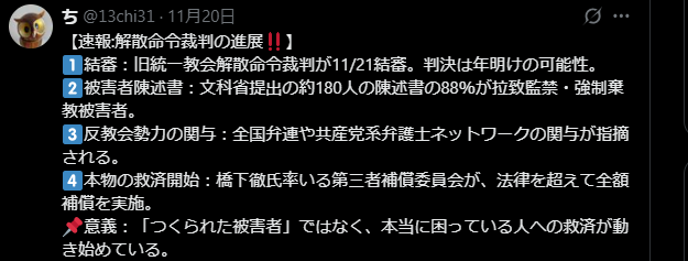 結審:旧統一教会解散命令裁判が11/21結審。判決は年明けの可能性。 被害者陳述書:文科省提出の約180人の陳述書の88%が拉致監禁・強制棄教被害者。 反教会勢力の関与:全国弁連や共産党系弁護士ネットワークの関与が指摘される。 本物の救済開始:橋下徹... -