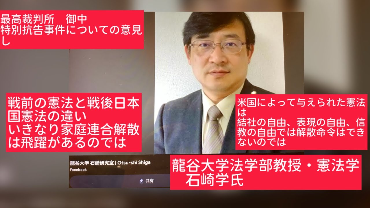 龍谷大学法学部・石崎学教授が最高裁に提出した意見書をもとに、家庭連合への解散命令の違憲性を論じた動画。戦後憲法が保障する信教の自由・結社の自由の観点から、民法上の不法行為を理由に宗教法人の法人格を奪うことの論理的飛躍を指摘し、明治以来の宗教弾圧史を踏まえた広い視点で問題提起している。