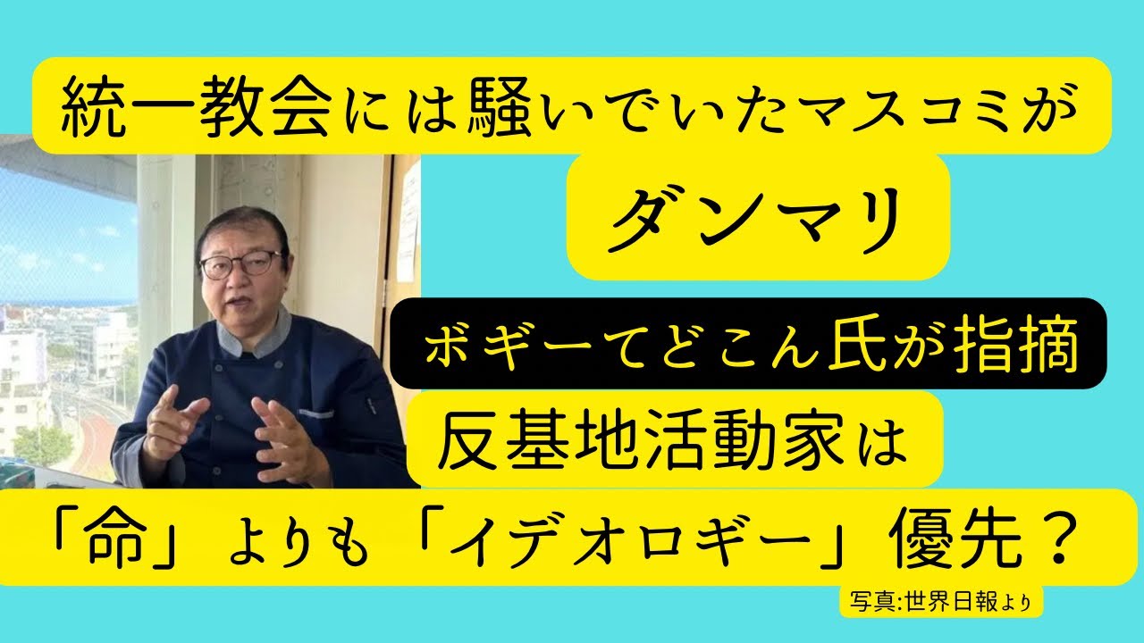 ・ボギーてどこん氏の指摘を元に、マスコミが統一教会問題を激しく追及する一方で、左翼的なキリスト教団体や沖縄の反基地活動には沈黙しているメディアの偏向性を批判しています。