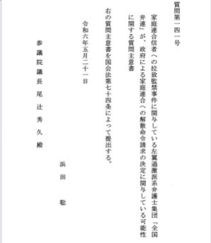 「質問主意書」は浜田聡前参議院議員(NHK党)が(令和6年5月21日)提出したもので、旧統一教会(現・世界平和統一家庭連合)への政府の解散命令請求に、左派系弁護士団体「全国霊感商法対策弁護士連絡会(全国弁連)」が深く関わっている可能性を問題視しています。