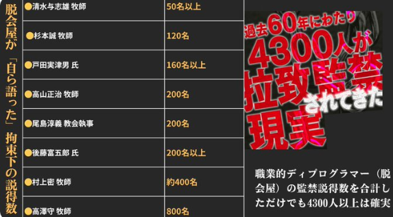 統一教会信者4300人以上が、統一教徒とは、その一点だけの理由で 拉致監禁され、 最長12年5か月個人施設に窓のない鉄格子で 監禁、暴言、人権殺人、個人の自由剥奪、食事制限、うつ病、精神的虐待を受けた。