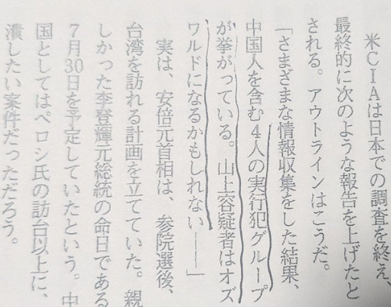 月刊「テーミス」(22年9月号)の報道が注目される。 ◆ 米CIAが日本で独自調査を実施し、最終報告を作成 ◆「中国人を含む4人の実行犯グループ」が浮上 ◆ 中国は安倍氏の訪台湾を阻止したかった
