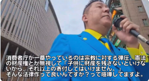 立花孝志氏は、テレビでは旧統一教会は悪く言われているが、実際は犯罪を犯しておらず、安倍元首相が殺され、暴力によって人を殺したことによって旧統一教会を潰そうとしているのが岸田元首相だと指摘した↓