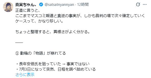 公判で示されたのは、 ・UPFビデオが動機ではなかったこと ・犯行直前まで標的が定まっていなかったこと ・困窮の主因が献金ではなく銃製造の借金だったこと など、事件直後に流通した説明とは異なる点だった。 にもかかわらず、事件後の報道は 「母の献金... -