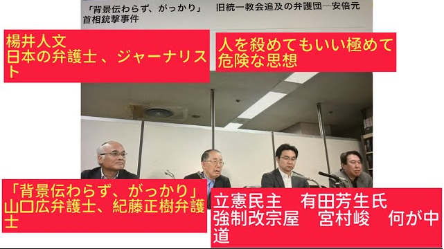 1月24日「背景伝わらず、がっくり」山口広弁護士 紀藤正樹弁護士 楊井人文(やない ひとふみ)弁護士「人を殺めてもいい極めて危険な思想」有田芳生氏が強制改宗屋 宮村峻と連携 なぜ中道から出馬【田村政治チャンネル】