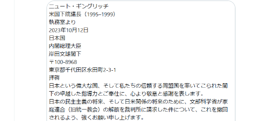 浜田聡氏が、ニュート・ギングリッチ元下院議長が岸田にあてた手紙を公開。