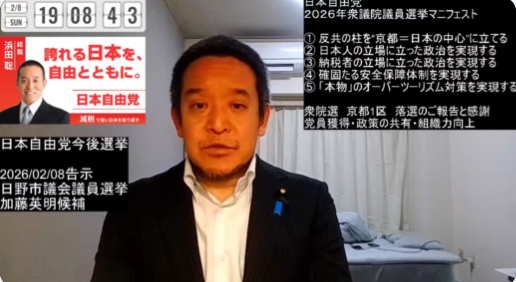 昨年秋に立ち上げた「赤ちゃん」のような政党で、しっかりと政策を訴え、政治スタンスを明確にし、旧統一教会との関係も隠すことなく、京都1区で堂々と戦った日本自由党総裁の浜田聡候補。この人は今の日本の国会に絶対に必要な人。