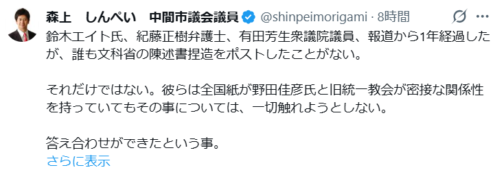 鈴木エイト氏、紀藤正樹弁護士、有田芳生衆議院議員、報道から1年経過したが、誰も文科省の陳述書捏造をポストしたことがない。
