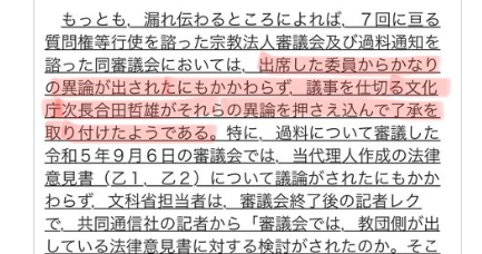 【宗教審議会の実態】 漏れ伝わるところによれば,7回に亘る質問権等行使を諮った宗教法人審議会及び過料通知を諮った同審議会においては,出席した委員からかなりの異論が出されたにもかかわらず,議事を仕切る文化庁次長合田哲雄がそれらの異論を押さえ込んで了承を取り付けたようである。