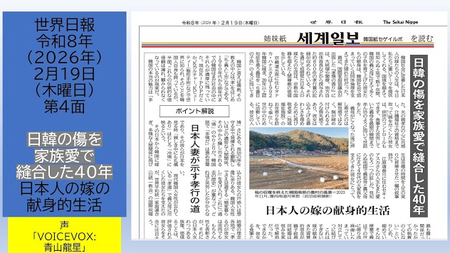 日韓の傷を家族愛で縫合した40年 日本人の嫁の献身的生活/姉妹紙 韓国紙セゲイルボを読む/世界日報20260219第4面