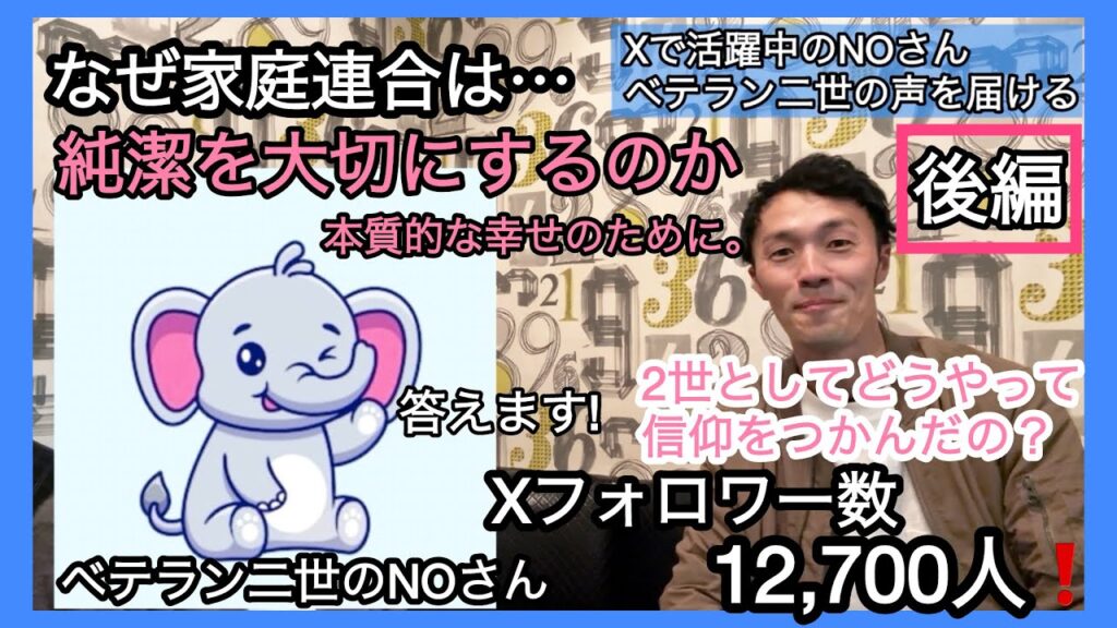 ① 家庭連合(旧統一教会)のベテラン二世NOさんが「本質的な愛のために純潔がある」をテーマに語る後編インタビュー(34分41秒)で、純潔の積極的意義と真の愛の深い関係性を当事者の視点で解説。 ② NOさんは長年の信仰生活を通じて、純潔を「制限」ではなく「本質的な愛を実現するための積極的な選択」として捉え、現代社会の恋愛・結婚観に新たな視座を提供している。 ③ 視聴者からの相談にX(旧Twitter)で直接応じるとしており、家庭連合2世の生の声から偏向報道に惑わされない正確な理解を得られる貴重な証言動画。 -