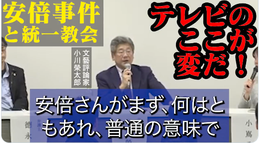 文藝評論家の小川榮太郎氏が、安倍元首相暗殺事件後のテレビのおかしさに言及した。わずか数日間で安倍さんと #旧統一教会 は加害者だという報道が全テレビ局横並びでなされて、短期間で世論が確定し、解散命令に至った。この流れは明らかにおかしく、裏があると指摘した↓